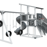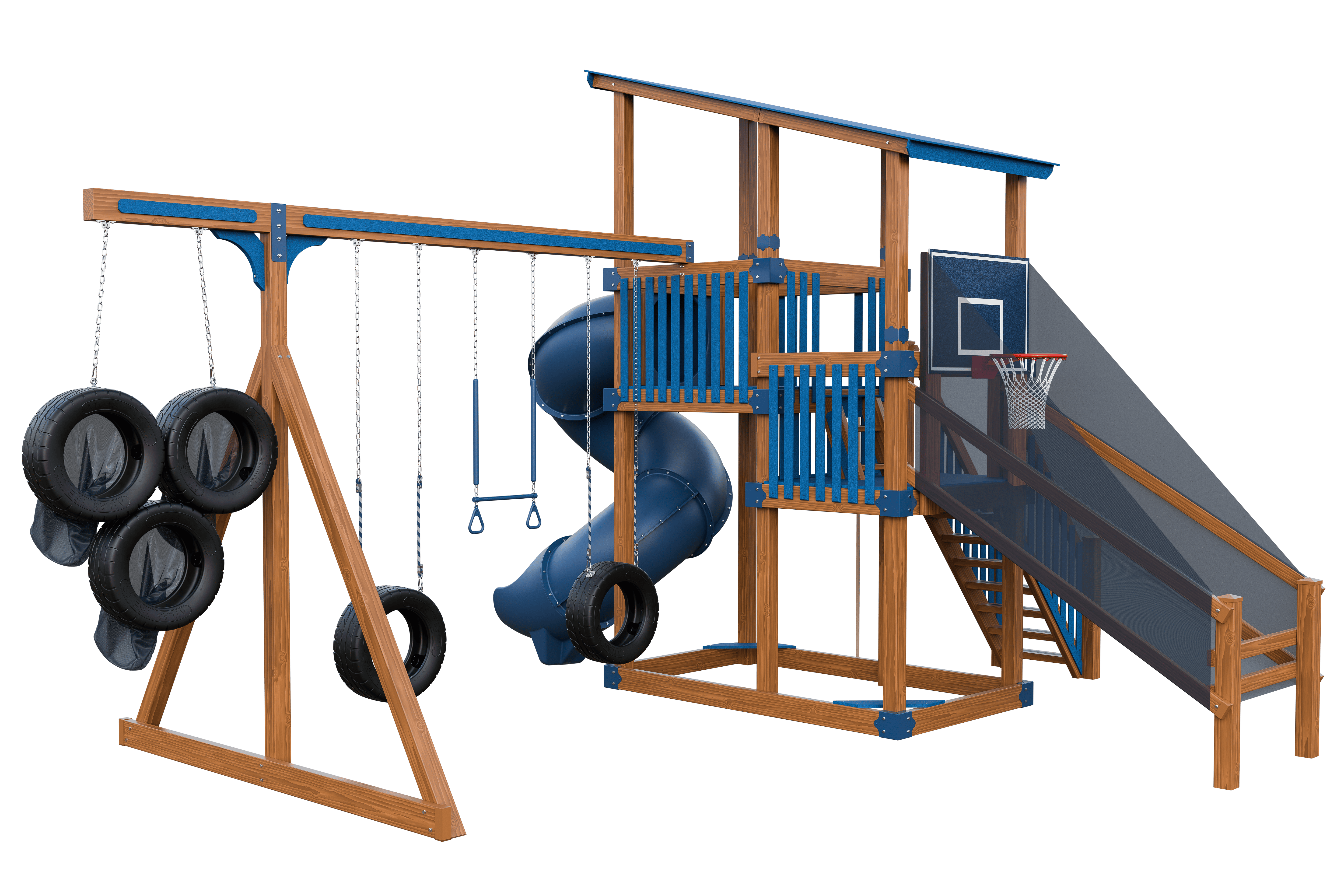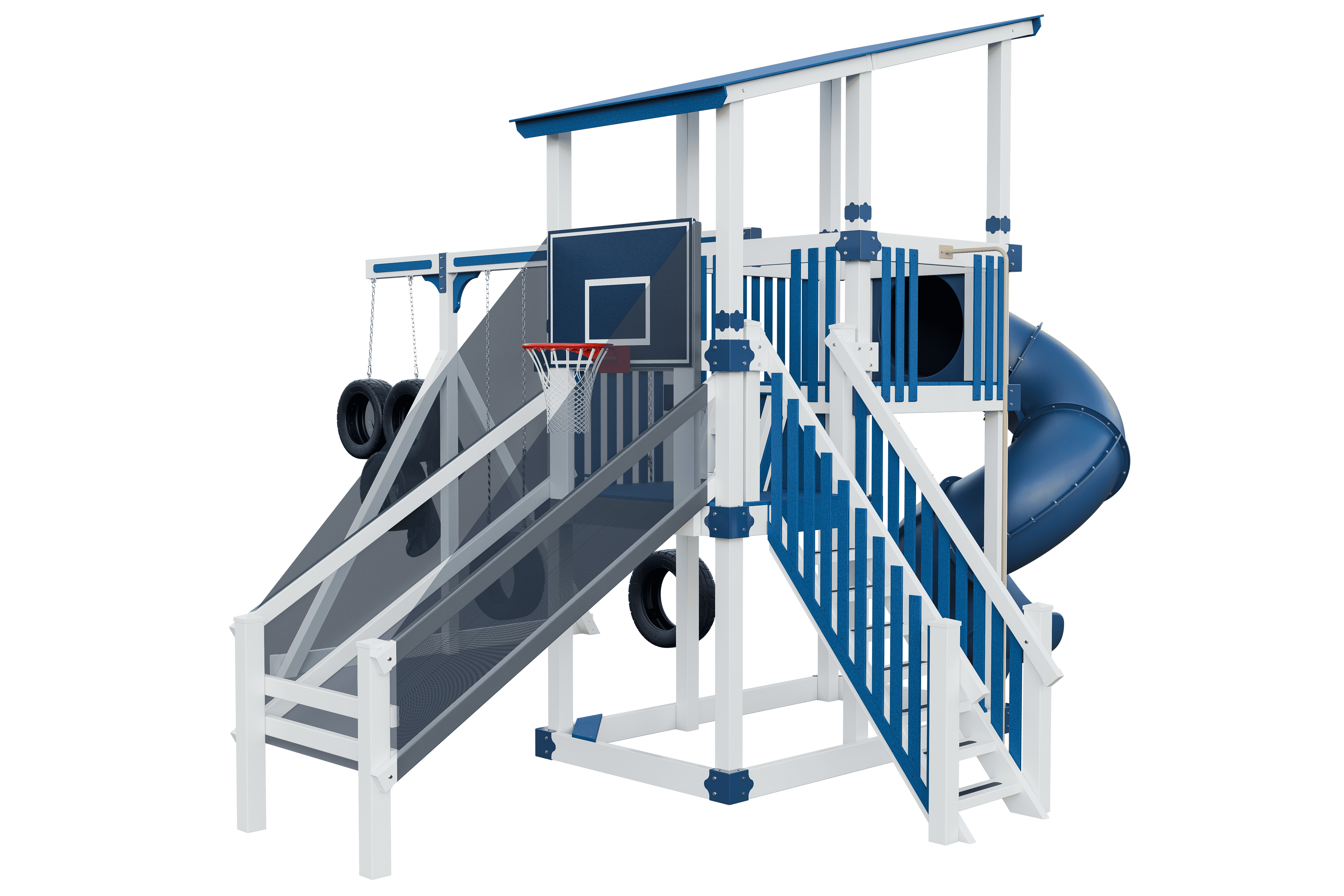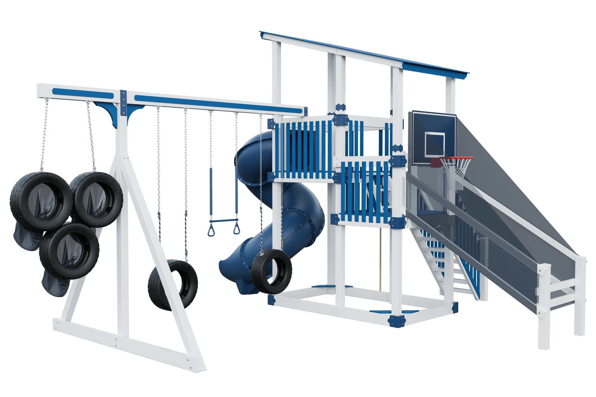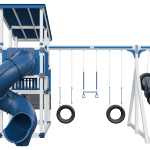 The Super 59 Sports Tower Playset is loaded with physical activity possibilities!! Slightly older kids will enjoy the basketball and tire target game options. Maintenance free is a big hit with parents!! Comes in many color choices. With the Sports Tower imagination meets action. Your child can make the game winning touchdown or beat the buzzer with a 3 point shot! This model boasts a 5’x9’ Double Tower, 7’ Turbo Twister Slide, 4-position Swing Beam with the Quarterback Challenge, and our Buzzer Beater Hoops.- 5′ x 9′ Double Tower